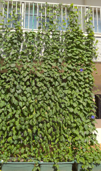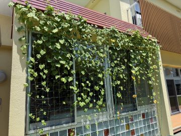 建物の窓際で、つる性植物(アサガオやゴーヤ等)を育てることで、日差しを防ぎ室温の上昇を抑える効果があります。これまでの実施校